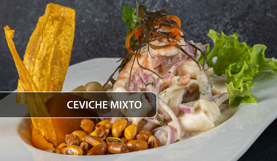 Especialidad de la casa Ceviche mixto Con Chicharrón De Pescado, Crema De Ají Limo, Yuyo, Camote, Choclo, Chifles.
