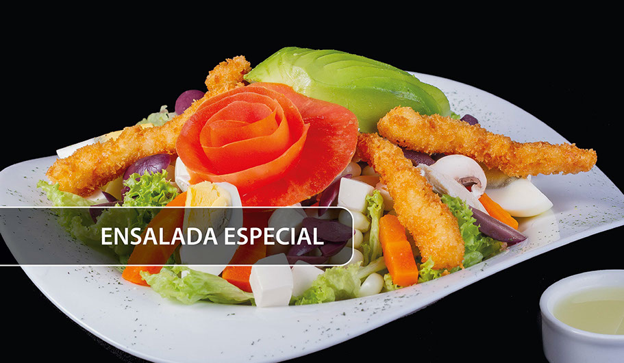 Mix De Lechugas, Bastones De Zanahoria, Choclo Peruano, Champiñones, Palta, Queso Fresco, Huevo Duro, Aceitunas, Pollo Cocido Y Camarones Apanados.