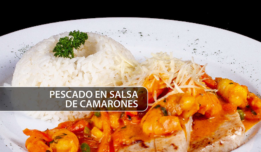 Filete De Pescado Bañado En Una Suave Salsa Con Camarones Ecuatorianos Acompañados Con Arroz Blanco.