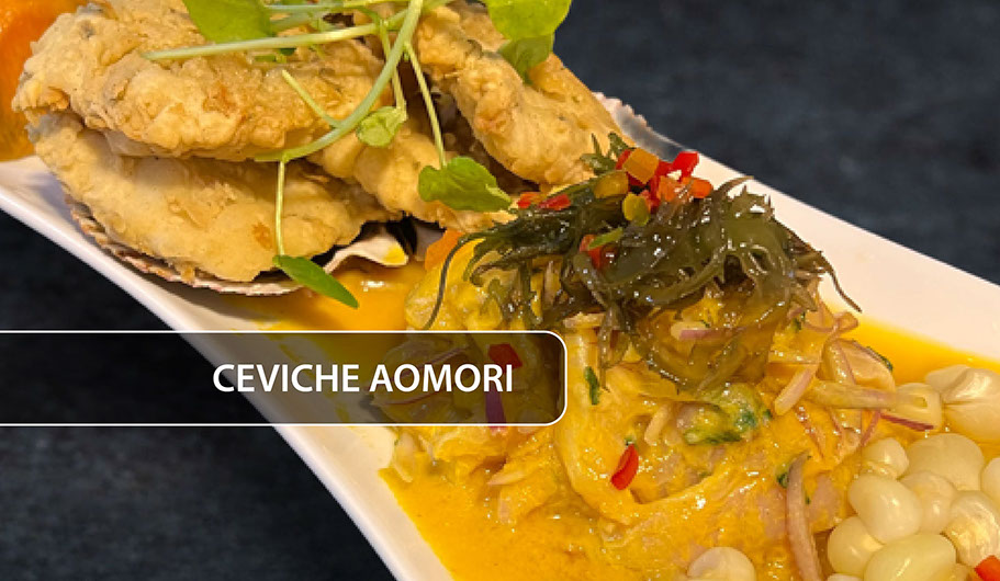 Ceviche de reineta, Al Mejor Estilo Peruano Con Chicharrón De Calamar, Yuyo, Camotes, Chifles, Choclo.
