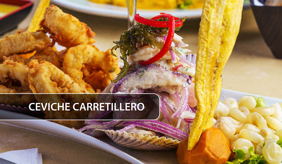 Especialidad de la casa Ceviche mixto Con Chicharrón De Pescado, Crema De Ají Limo, Yuyo, Camote, Choclo, Chifles.